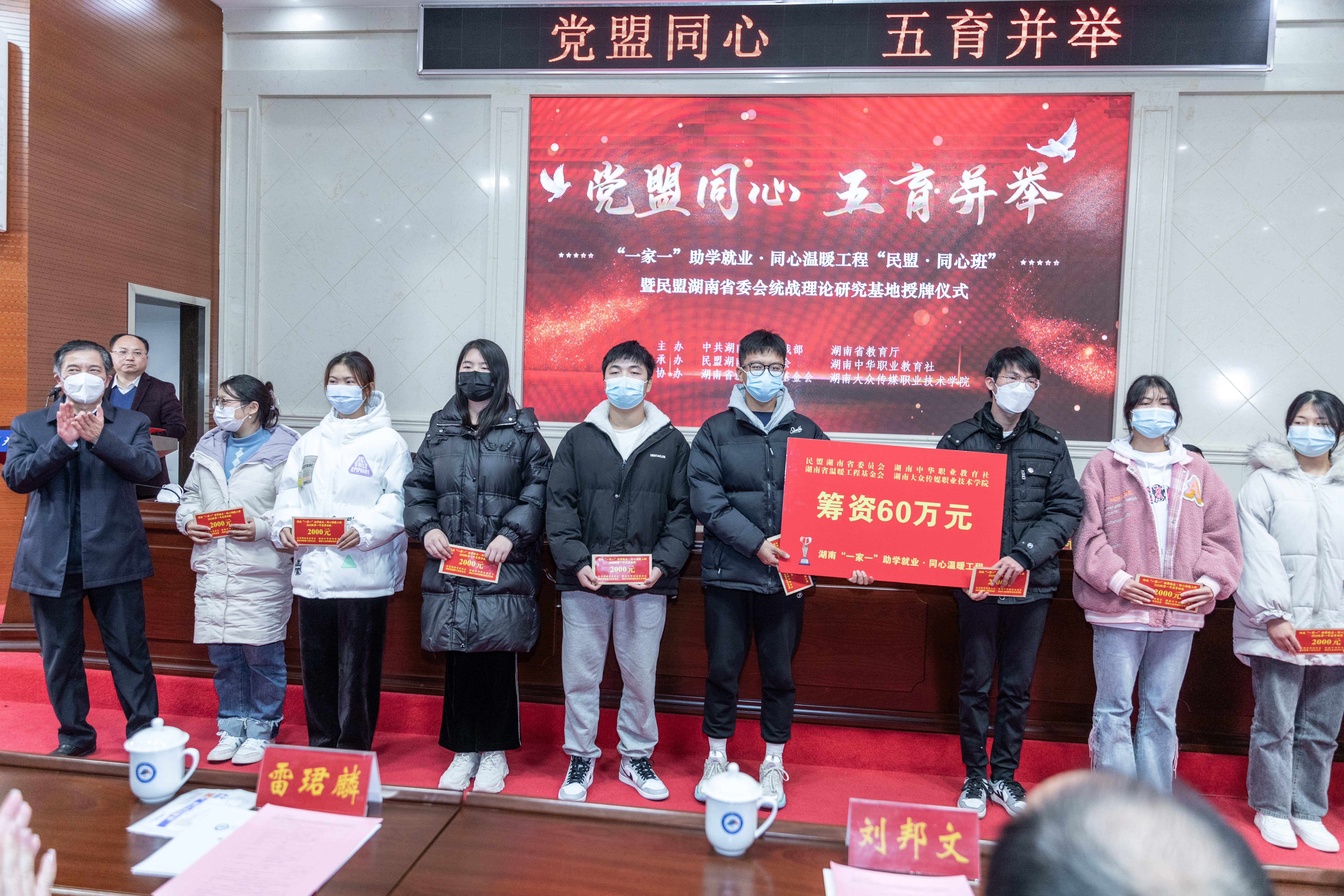 王仁祥为民盟湖南省委会统战理论研究基地授牌,刘邦文为民盟同心班授牌。冯波为同心班学生代表发放资助款。