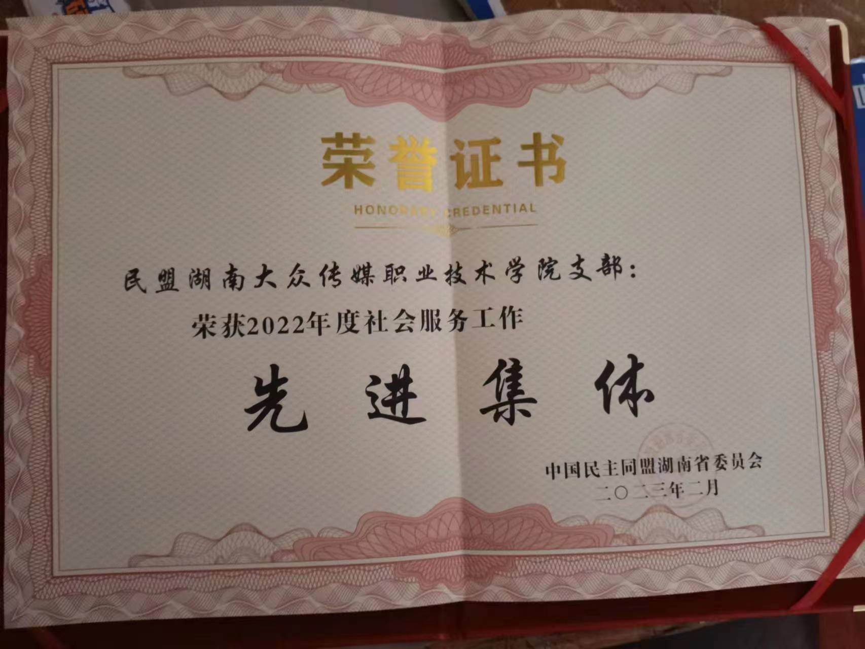 (谭玉菡 肖淇元 供稿)近日,民盟湖南大众传媒职业技术学院支部荣获民盟湖南省委员会2022年度“社会服务先进集体”称号。